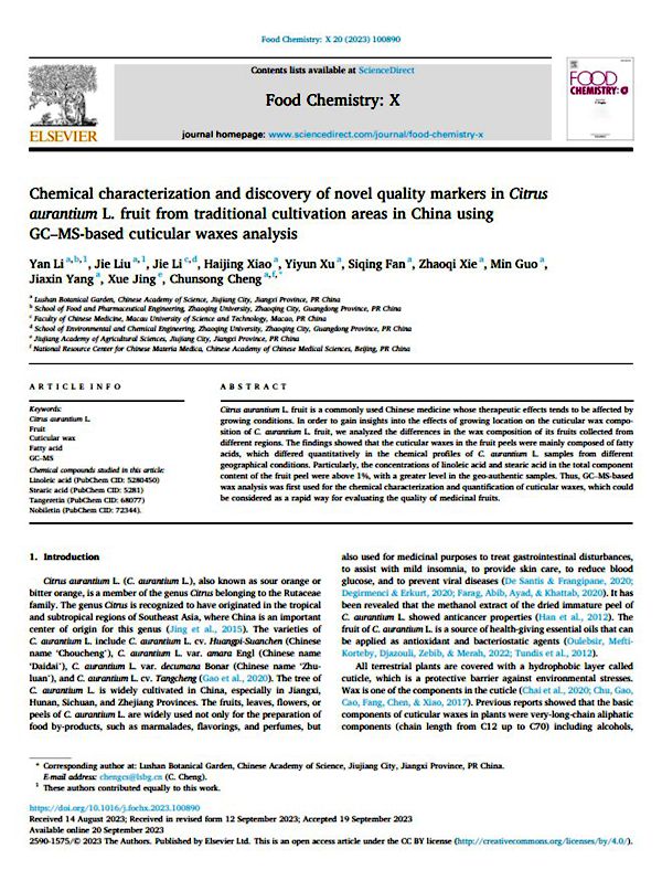 現代中藥質量控制體系包括性狀鑒定、理化鑒定、薄層分析、色譜分析、化學定量分析、分子鑒定等,而古代中醫、老藥工對藥材質量的把握更多的是通過口嘗鼻聞,依靠多年的對藥材的性味的感官經驗進行判斷。因此,在中國不少地區依然保留著老藥工“辨狀論質”的傳統技藝。中藥枳殼,是江西省著名的道地藥材之一。作為傳統中藥需求量很大,但由于采收習慣、品種選擇不當,導致市場枳殼藥材品類多、規格不統一。如在實際農業生產中,不同的栽培品種、生長地點、成熟階段和提取方法都會影響藥材的化學成分,因此仍然亟需一種新的質量標記物來鑒定枳殼的質量。廬山植物園TCM課題組通過長期市場觀察,發現道地枳殼干燥生藥表面常常“泛霜”,而產自浙江、四川等地的枳殼沒有該特點。從而提出是否可以利用果實類表面蠟質測定技術實現道地藥材鑒定,以及開發藥材質量評估新技術方法的假設開始,團隊利用半年時間實現了該項工作的順利推進,訪問學者李燕博士為論文第一作者,廬山植物園劉杰博士為共同第一作者,程春松博士為通訊作者,日前在中國科學院1區期刊Food Chemistry: X,發表文章“Chemical characterization and discovery of novel quality markers in Citrus aurantium L. fruit from traditional cultivation areas in China using GC–MS-based cuticular waxes analysis”,文章全面闡述了利用果實表面蠟質檢測技術實現指導道地藥材快速鑒定,并通過相關性分析揭示了長鏈脂肪酸、酯類以及有效成分之間的相關性。文章首次報道了果實類藥材(枳殼)表面蠟質可以作為重要的檢測指標,發揮著藥材道地性闡述、中藥質量評估的重要作用。
