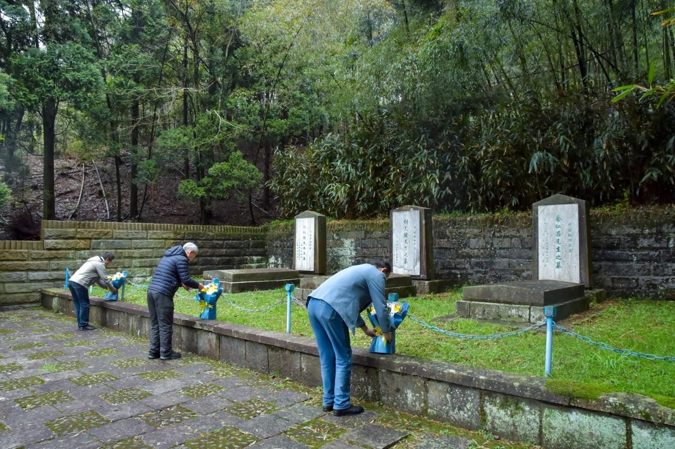 當天廬山,雨過天晴,水綠山青。廬山植物園主任黃宏文、黨委書記魏宗賢、副主任張樂華向“三老墓”敬獻花籃,全體職工代表默哀鞠躬,表達對長眠于此三位先輩的敬意和哀思。