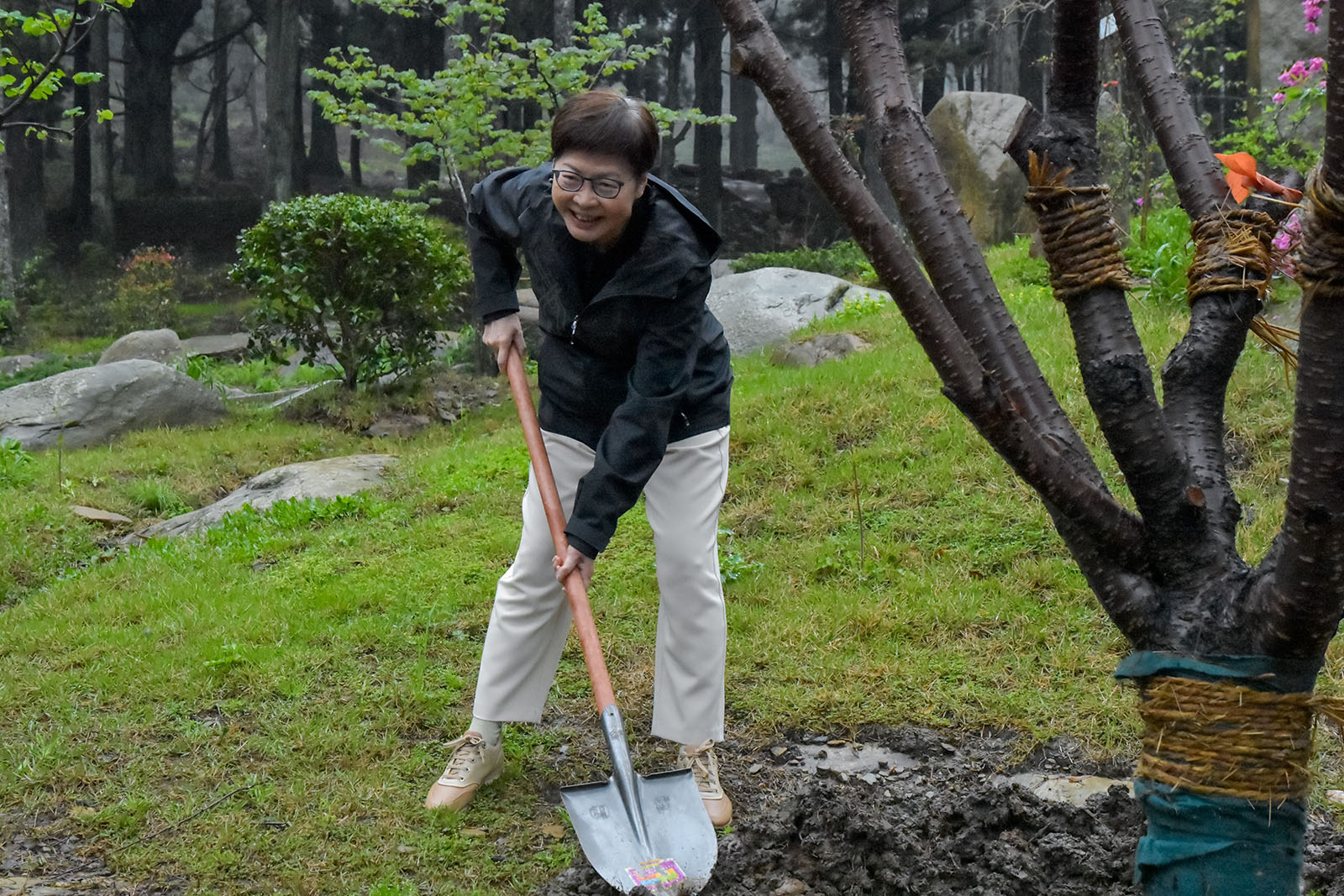 到訪期間,林鄭月娥親手種植了一棵櫻花樹。黃宏文也代表廬山植物園向林鄭月娥贈送一本由他本人主編的《中國植物園》,表達歡迎和感謝。